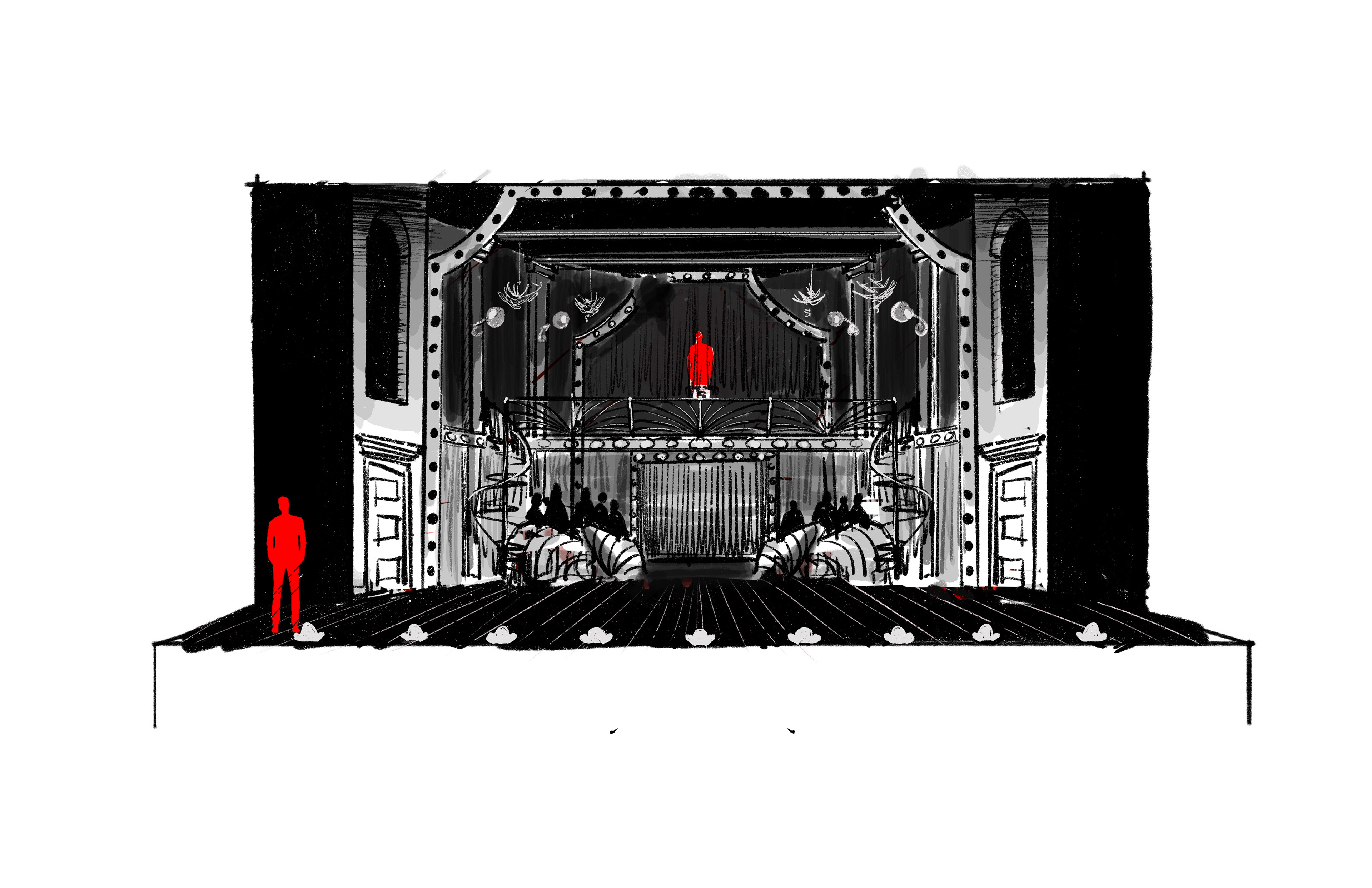 I wanted the club to enclose the action of the cavernous theatre–drawing the action further downstage. The trick was also letting it feel large and formerly grand. My idea was to use height as the opening device while keeping the amount of stage space relatively low. The team was drawn to the idea of mirrored spiral staircases as well as a visible band on stage. A set of brick walls and doors completes a downstage portal that allows for book scenes in Cliff’s flat and scenes with Shultz and Schneider. The upstage balcony allows for more dramatic movement as well as a perch for the Emcee to obverse and interact throughout the production.